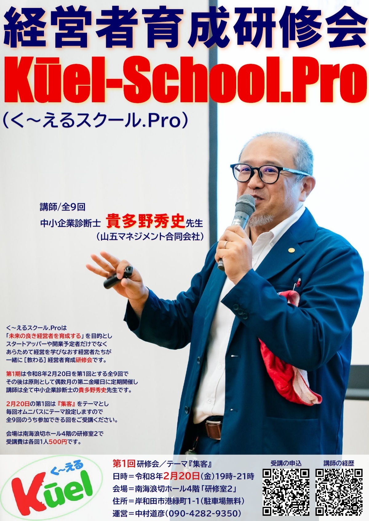 Kūel-School.Pro(く~えるスクール.Pro)は、「未来の良き経営者を育成する」を目的とし スタートアッパーや開業予定者だけでなく、あらためて経営を学びなおす経営者たちが、一緒に[教わる]経営者育成研修会です。